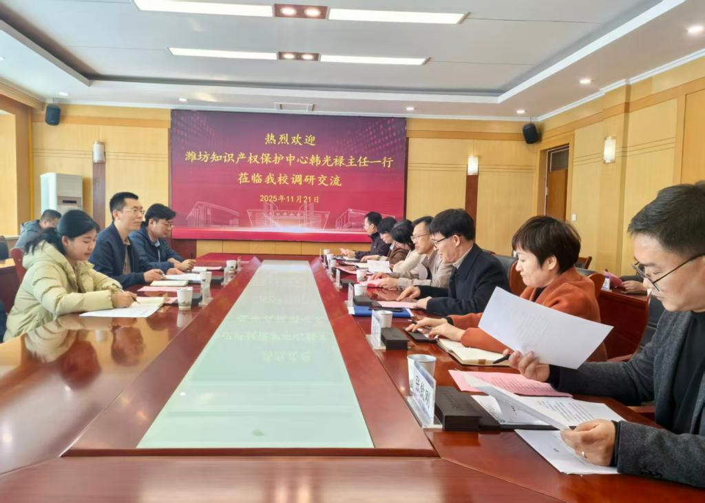 为深化知识产权协同保护,赋能高校科技创新,11月24日,潍坊知识产权保护中心(以下简称“保护中心”)确权质控科科长韩光禄一行来校调研交流。寿光市市场监管局党组成员、二级主办董建波,学校党委委员、副校长张友祥,及相关部门负责人陪同座谈。